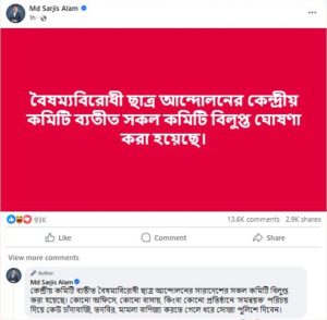 ফেসবুক পোস্টে সারজিস লিখেছেন, ‘বৈষম্যবিরোধী ছাত্র আন্দোলনের কেন্দ্রীয় কমিটি ব্যতীত সকল কমিটি বিলুপ্ত ঘোষণা করা হয়েছে।’এরপর নিজের পোস্টের কমেন্ট সেকশনে তিনি মন্তব্য করেন, ‘কেন্দ্রীয় কমিটি ব্যতীত বৈষম্যবিরোধী ছাত্র আন্দোলনের সারাদেশের সকল কমিটি বিলুপ্ত করা হয়েছে। কোনো অফিসে, কোনো বাসায়, কিংবা কোনো প্রতিষ্ঠানে ‘সমন্বয়ক’ পরিচয় দিয়ে কেউ চাঁদাবাজি, তদবির, মামলা বাণিজ্য করতে গেলে ধরে সোজা পুলিশে দেবেন।’