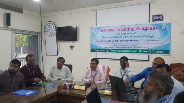 চাঁপাইনবাবগঞ্জ সরকারি মহিলা কলেজে শিক্ষক-কর্মকর্তাদের জন্য ইন-হাউস প্রশিক্ষণ প্রোগ্রাম অনুষ্ঠিত হয়। মঙ্গলবার (২৯ জুলাই) কলেজের শিক্ষক মিলনায়তনে দিনব্যাপী প্রশিক্ষণে প্রধান অতিথি হিসেবে অনলাইনে উদ্বোধনী বক্তব্য রাখেন জাতীয় শিক্ষা ব্যবস্থাপনা একাডেমির